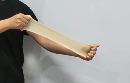 1.首先确定硅胶做什么用途,选择对应液体硅胶类型,比如做仿真硅胶皮肤,用的人体硅胶的硬度、抗撕裂性都有差异。如图可见我们液体硅胶靠人力是很难撕裂的。