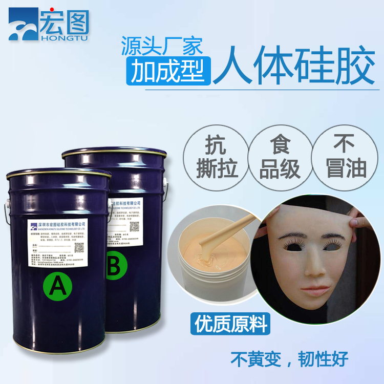 人体硅胶是一种加成型双组份液体硅橡胶,无毒无味安全环保,硫化后会成为柔软的弹性材料。 人体硅胶分AB双组份,A组分硅胶,B组分固化剂,A:B一般为1:1。该产品既能室温固化,也可以加温固化,颜色为无色或皮肤色,其它颜色需联系我司进行特调。