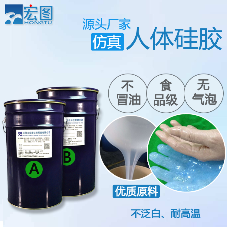 仿真人体硅胶是一种加成型A、B双组份液体硅胶,AB均为无色液体。人体硅胶无毒无味、安全环保,AB组分配比为1:1,可室温固化也可以加温固化。